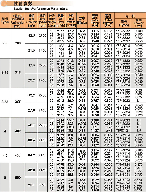 T35-11系列軸流風機是在T30-11的基礎上改進設計的新型風機,主要優點是結構更合理,性能有了較大提高。本系列風機葉輪直徑由小到大有三十個規格,每一規格風機的葉片都為4片,葉片角度有15o、20o、25o、30o、35o五種,參數范圍廣,風量826~67892m3/h,風壓3.9~48.3mmH2O(詳見參數表)。