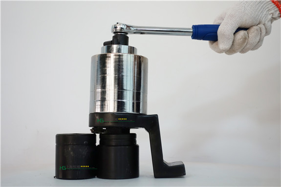 3、按下電源開關,扳手啟動。當反力支架力臂靠牢支架時(支點可以是鄰近的一只螺栓或其他可作支點的位置)螺栓開始擰緊。當螺栓扭矩達到預定扭矩時,扳手自動停止,緊固完成,松開電源開關,進行下一只螺栓的擰緊工作。